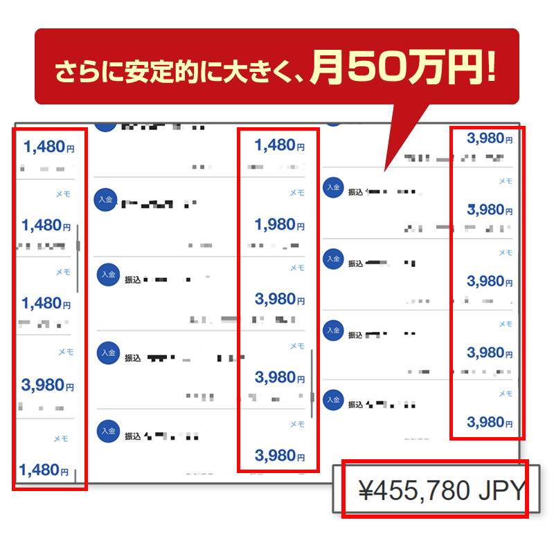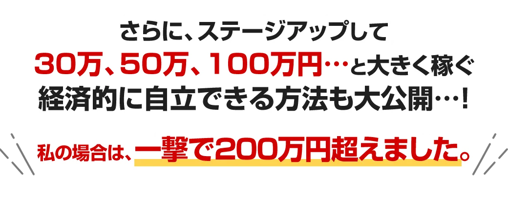 さらに、もっと大きく稼ぎ続けられる方法にシフトしたことで、一気に50万、100万、200万円…というように、今までの私では想像できなかったほどの結果を得られるようになりました。